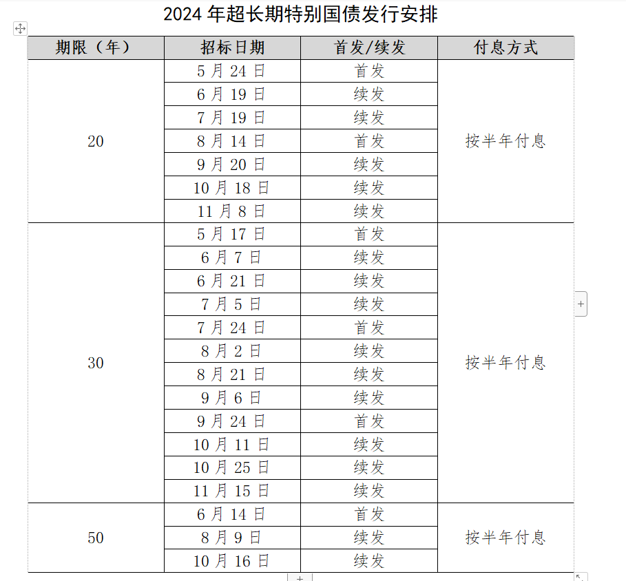 根据发行安排,首发的20年期超长期特别国债是固定利率附息债,发行总额为400亿元,通过财政部北京证券交易所政府债券发行系统进行招标发行。票面利率在5月24日上午通过承销团竞争性招标后确定。
