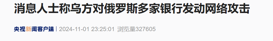 当地时间11月1日,总台记者获悉,乌克兰国家通讯社引述匿名消息人士的话称,乌克兰国防部情报总局的网络专家对克里米亚的4家俄罗斯银行进行了大规模网络攻击,导致数万名俄罗斯用户无法在线访问其银行账户。