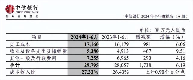 从财报来看,中信银行的业务及管理费用大增是导致利润增速放缓的关键,前三季度为467.02亿元,同比增加36.69亿元,增幅8.53%。