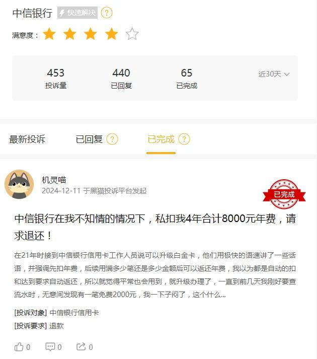 在黑猫投诉平台,截至12月13日,中信银行近30天投诉量为453条,已完成65条,投诉完成率约14%,投诉多涉及中信银行信用卡,这是公司需要改善的。