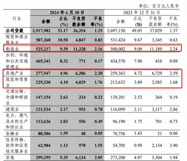 上述三大行业的不良贷款率分别为2.16%、2.3%、1.76%,其中房地产业的不良贷款率最高。