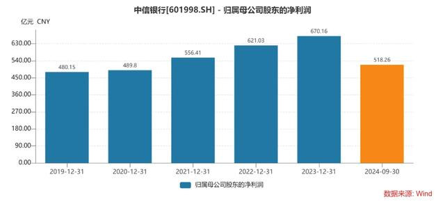 最近五年,中信银行的归母净利润呈现上升态势,分别为480.15亿元、489.8亿元、556.41亿元、621.03亿元、670.16亿元,增速分别为7.87%、2.01%、13.6%、11.61%、7.91%。