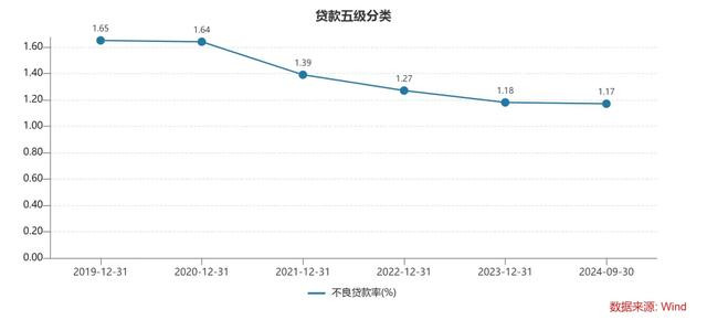 同期的不良贷款率总体呈现下滑态势,分别为1.65%、1.64%、1.39%、1.27%、1.18%,前三季度进一步下降至1.17%。
